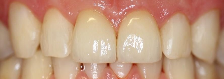 A traumatic bite led to the front teeth wearing down and chipping. To achieve this result, the bite was first corrected with orthodontic treatment. The teeth were bleached and ceramic veneers were then placed on the 2 central incisors. Resin composite bonding was then done on the other front teeth to cover the worn surfaces and mask the defects.